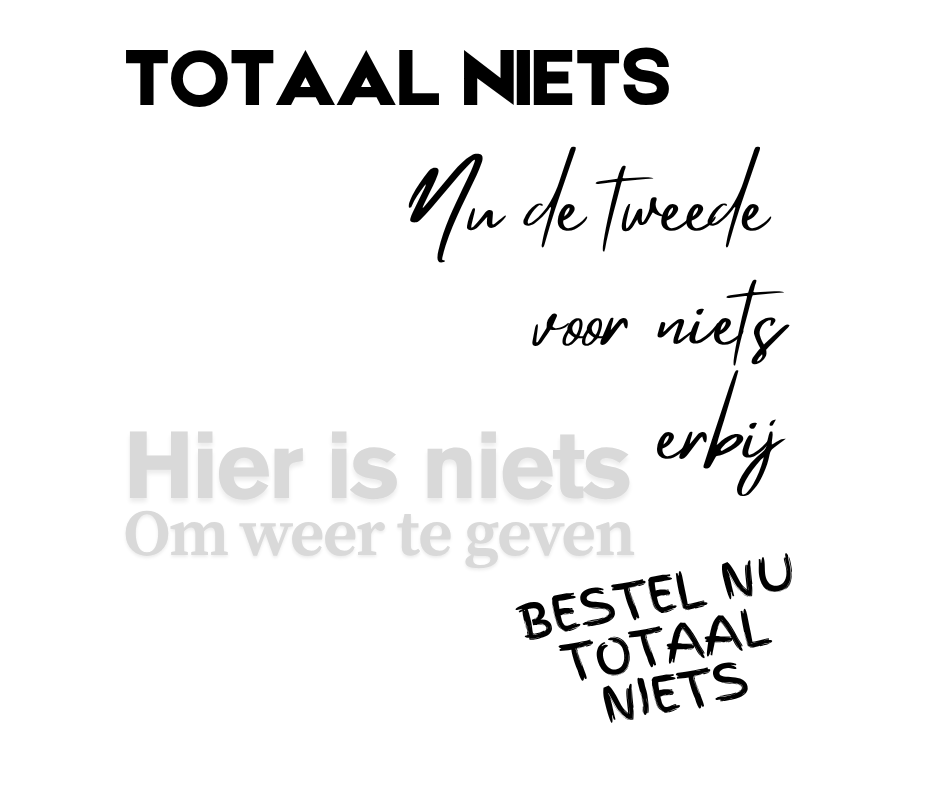 Dit is het topproduct uit onze catalogus! Ervaar de overgave bij het ontvangen van deze omvang aan niets. Want dit is niets meer en niets minder dan dat. Niet een beetje niets, ook niet bijna niets. Nee, dit is echt totaal niets. En omdat dit artikel nieuw is in onze catalogus ontvangt u nu een tweede exemplaar van Totaal niets voor niets erbij. Alsof het voor niets is.